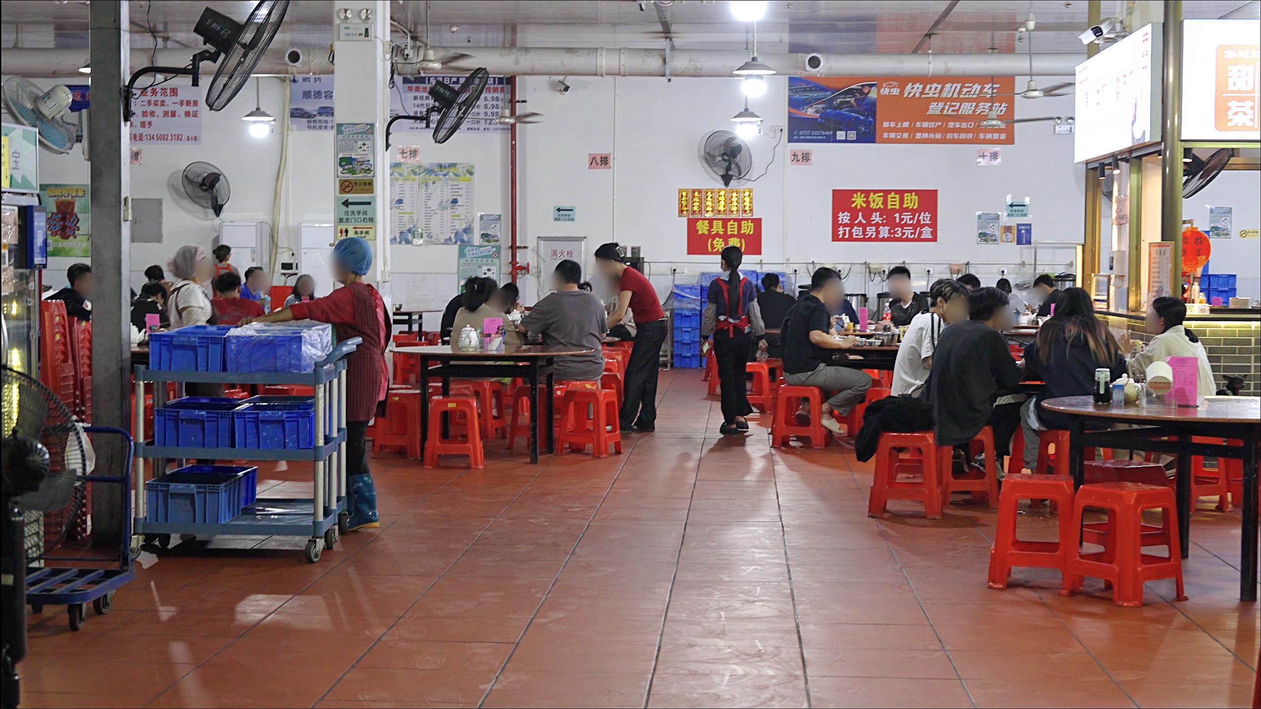 此时店里已经坐满了好几桌人,服务员忙碌地穿梭其中。店里的陈设很简单,餐桌是农村吃围餐时常见的圆形石桌,凳子则是大名鼎鼎的广东“省凳”——红胶凳,整个餐厅透露着一种独属于广东大排档的朴实无华。