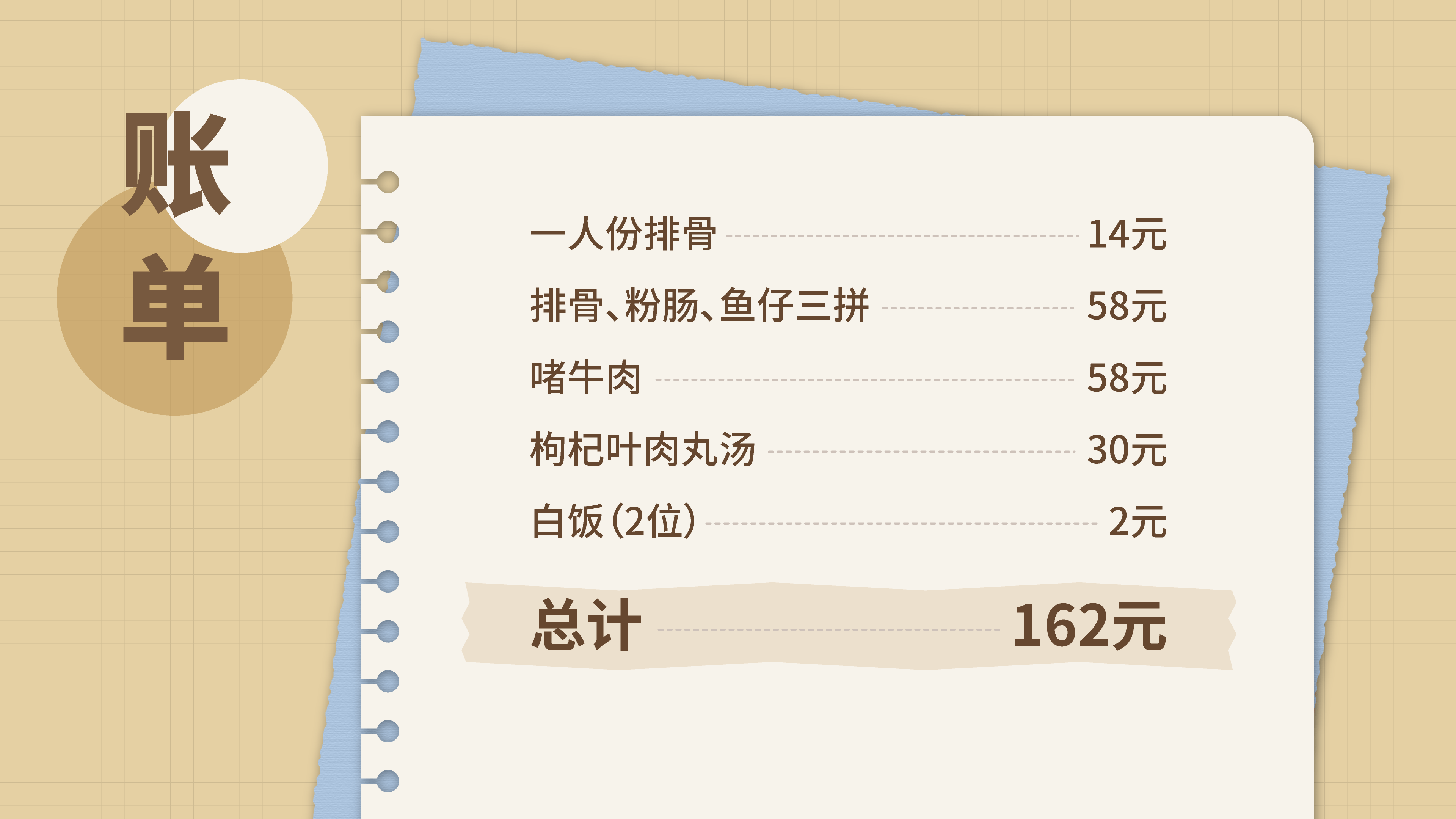这顿不知道算早餐还是宵夜的饭,一共花了162元。虽然听刚才的小姐姐说,以前的价格会更便宜,但我觉得两个人162元还能接受。不知道屏幕前的大家,觉得这顿饭贵不贵呢?