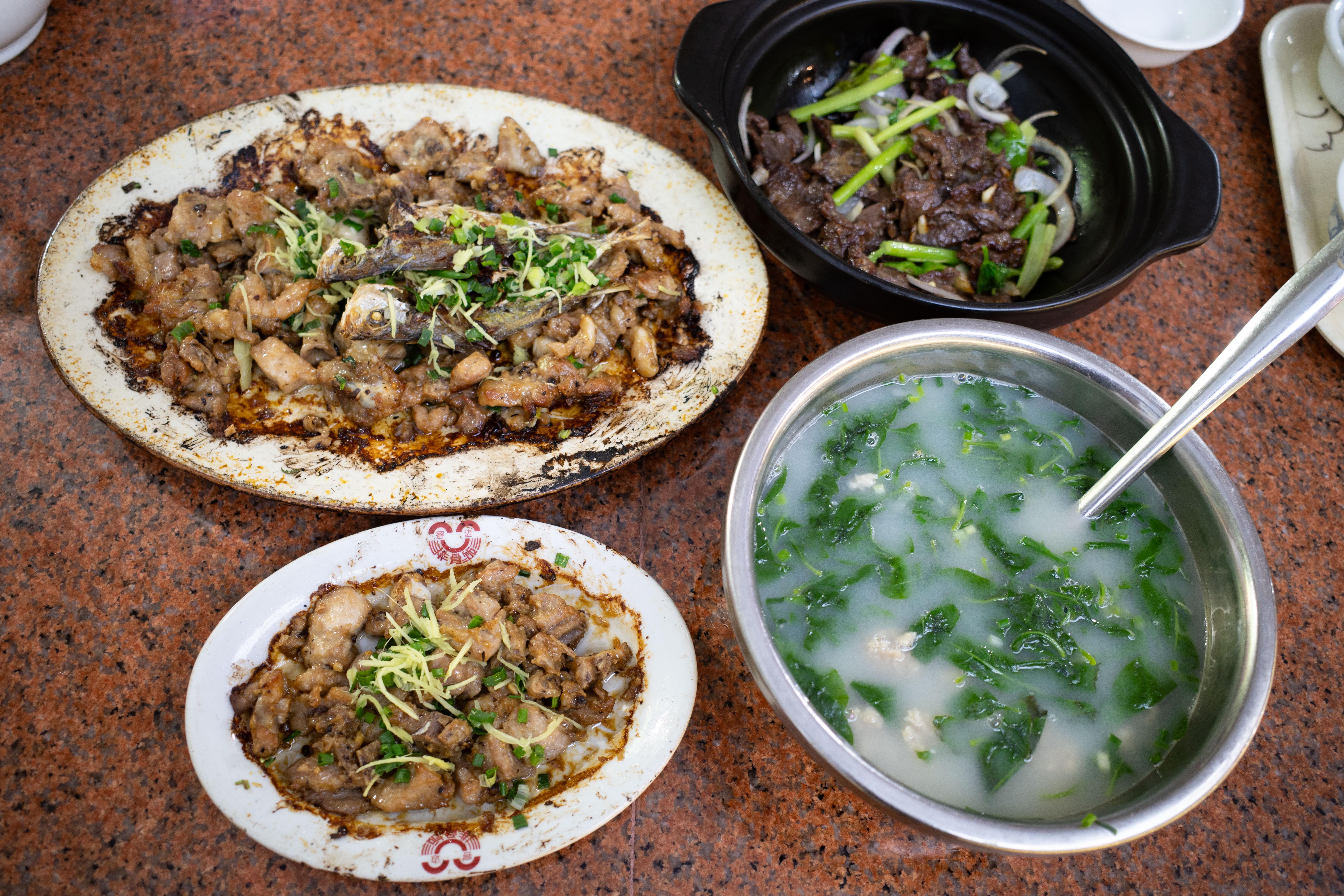 除了一人份排骨,我们还点了排骨、粉肠和鱼仔的三拼。原以为排骨已经足够惊艳,我没想到粉肠也毫不逊色。粉肠里塞了葱花,一扫令人反感的猪腥味,而且肉质滑嫩,平时不爱吃猪肠的我,和吃惯了重口味肥肠的小陈都停不下筷子,想一吃再吃。而鱼仔则偏咸香,有点像湖南人过年会腌制的小鱼干,带有一点“腊”味,非常好下饭。